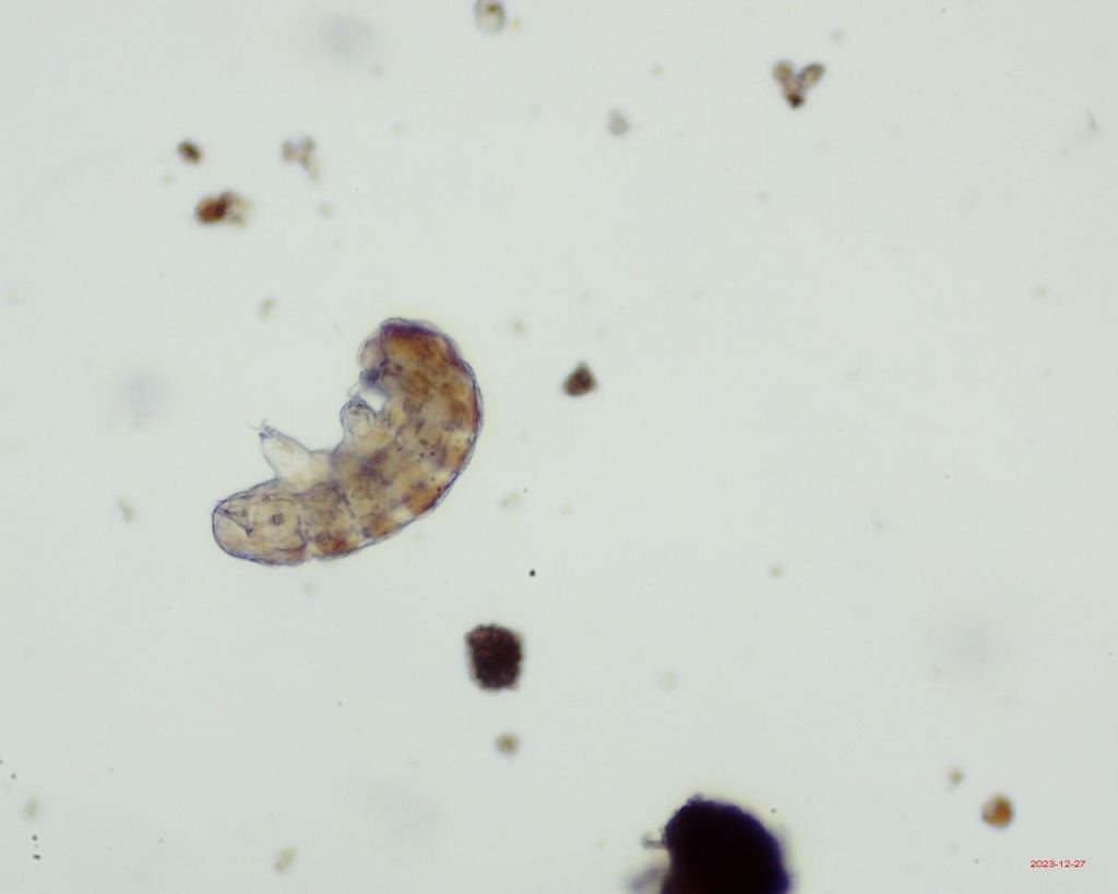 - x 20 will show little white, translucent tardigrades.