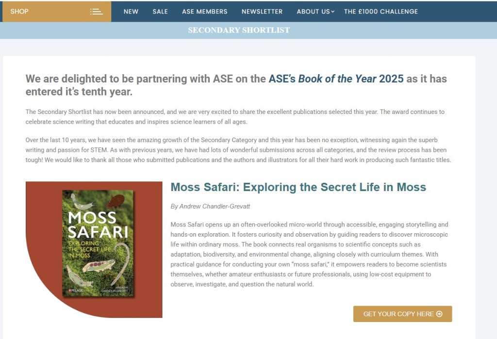 The Association for Science Education’s Annual Conference 2026 was held at Nottingham University last week (7-10th January). The significance for Moss Safari was that one, the Moss Safari book had been shortlisted for the ASE Book of the Year 2026 and two, I was doing a presentation to launch the new look,updated and free Moss Safari resources for teachers, parents and hobbyists. Here’s a blog of what happened. Did Moss Safari book win? What did delegates think of the new resources? Well I’ll spill all below.